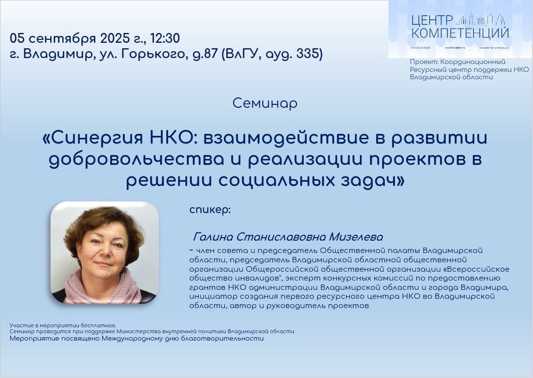 На мероприятии семинар проведет спикер: Галина Станиславовна Мизелева, член совета и председатель Общественной палаты Владимирской области, председатель Владимирской областной общественной организации Общероссийской общественной организации «Всероссийское общество инвалидов", эксперт конкурсных комиссий по предоставлению грантов НКО администрации Владимирской области и города Владимира, инициатор создания первого ресурсного центра НКО во Владимирской области, автор и руководитель проектов.