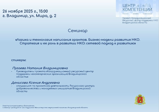 Ресурсный центр поддержки НКО, действующий при поддержке Министерства внутренней политики Владимирской области: vk.com/mvp33public, приглашает на семинар на тему: «Логика и технология написания грантов. Бизнес-модели развития НКО. Стратегия и ее роль в развитии НКО: сетевой подход к развитию»!